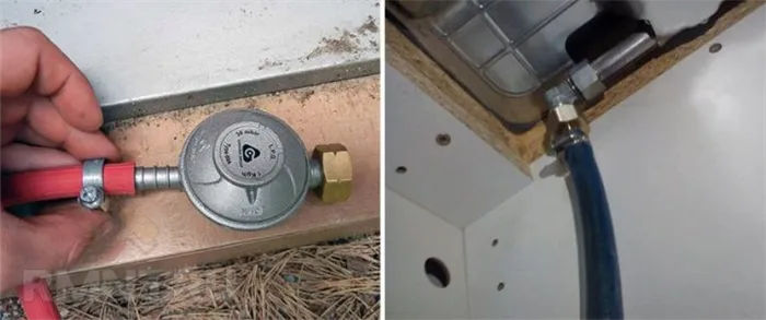 Прикручивание шланга должно осуществляться непосредственно к крану, никаких дополнительных соединений и лишних сгонов при этом быть не должно. Использование переходников допускается лишь в случае крайней необходимости, когда нет возможности приобрести совместимый с выходными отверстиями крана и печи шланг. При этом все соединения должны быть также хорошо промазаны герметиком и по окончании монтажа проверены при помощи мыльной пены.